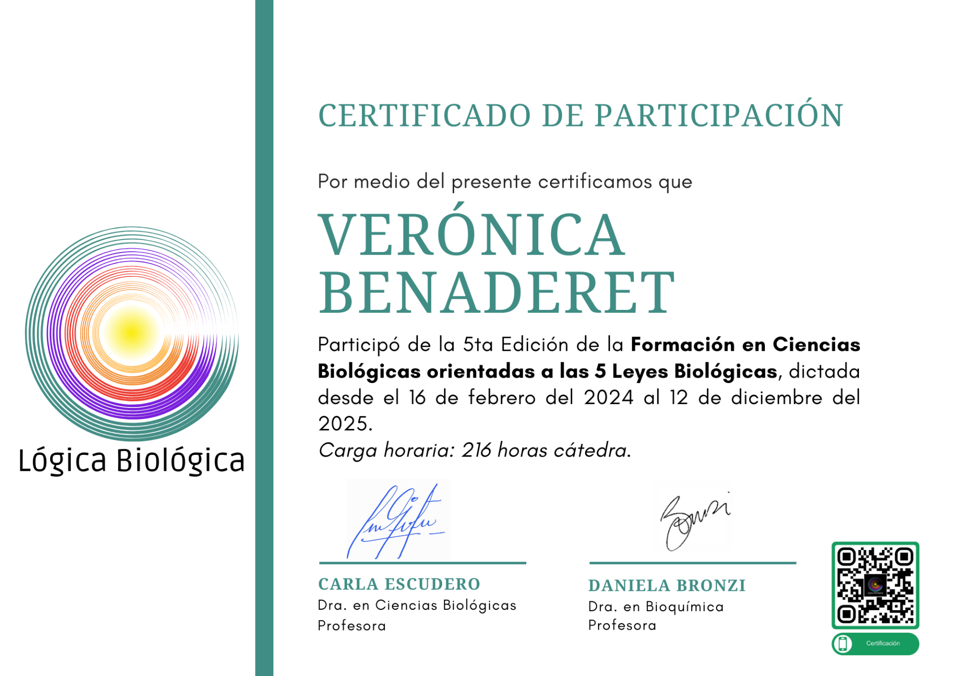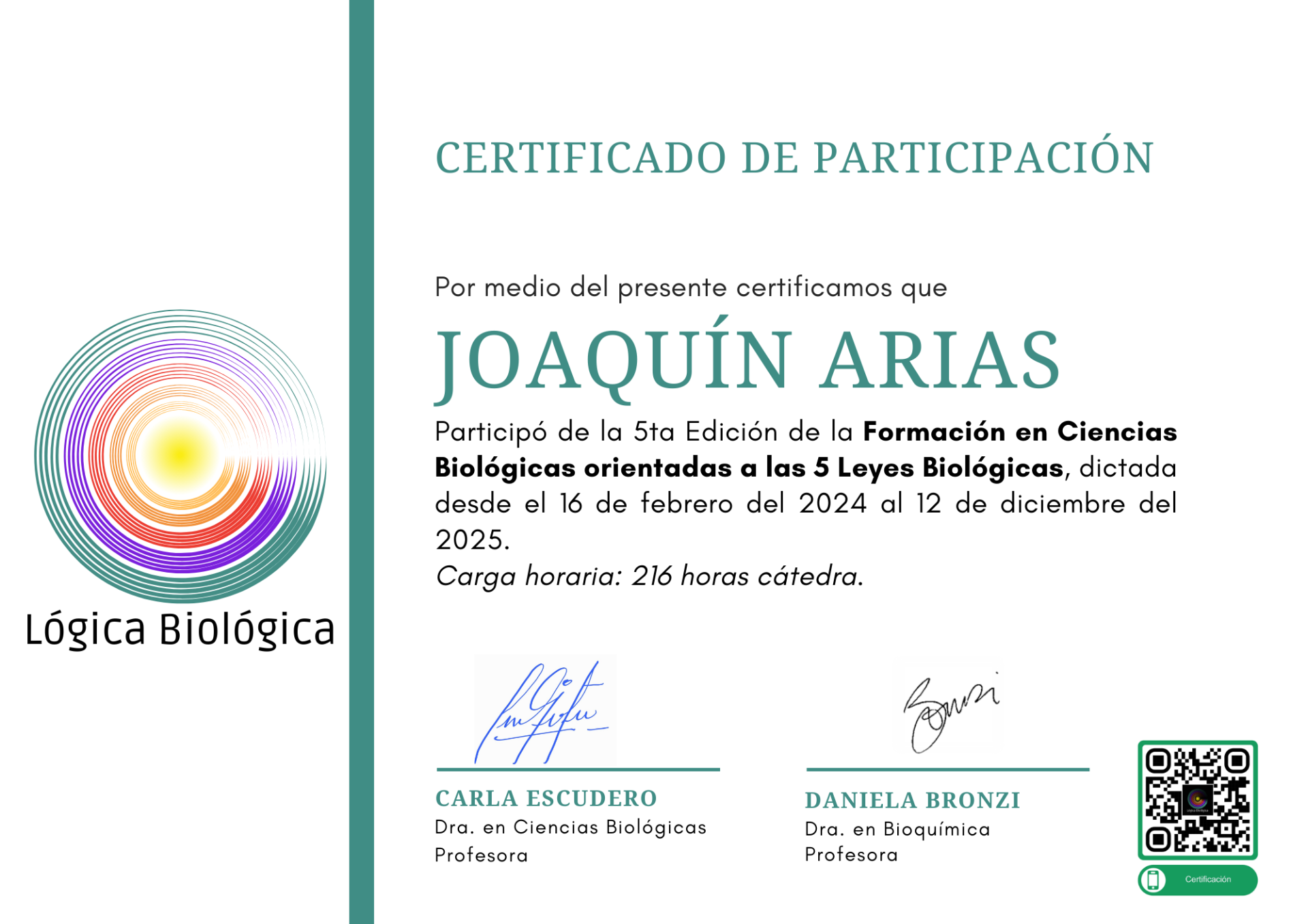 Las siguientes personas participaron de la 5ta Edición de la Formación en Ciencias Biológicas orientadas a las 5 Leyes Biológicas, dictada desde el 12 de febrero del 2024 al 12 de diciembre del 2025.